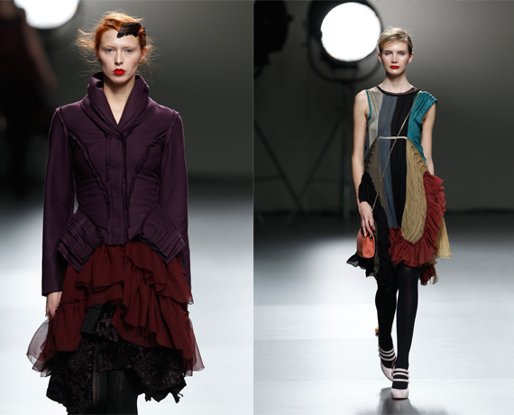 Victorio & Lucchino: Comenzaba la jornada y lo hacía con palmas, castañuelas y taconeo. Los tonos berenjena y el negro fueron protagonistas de asimetrías gitanas.